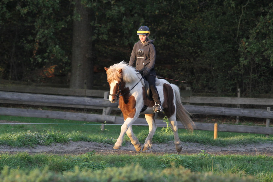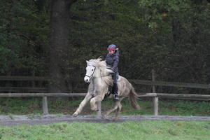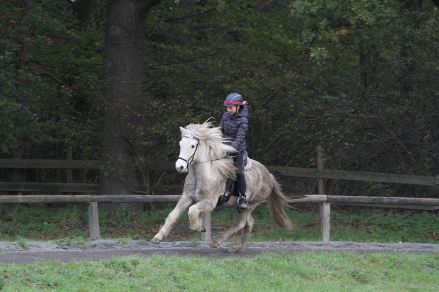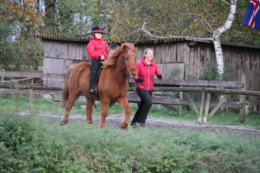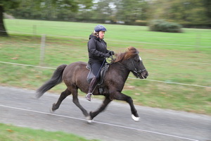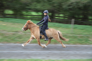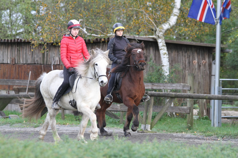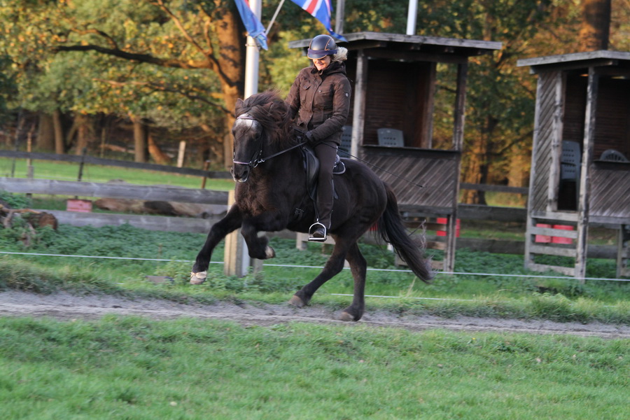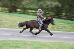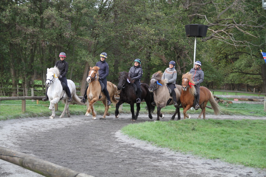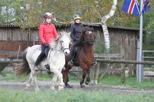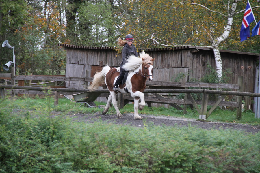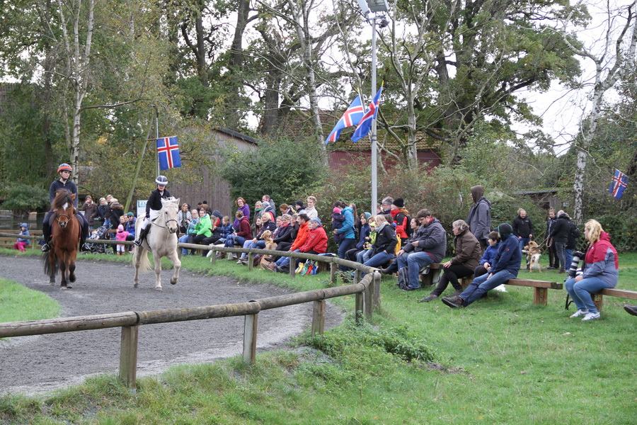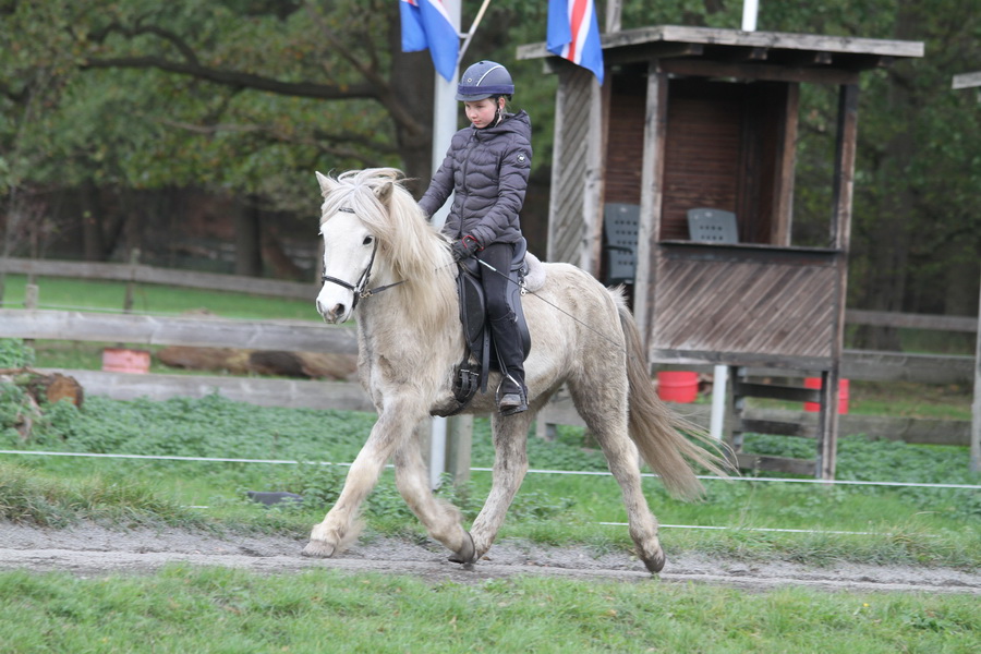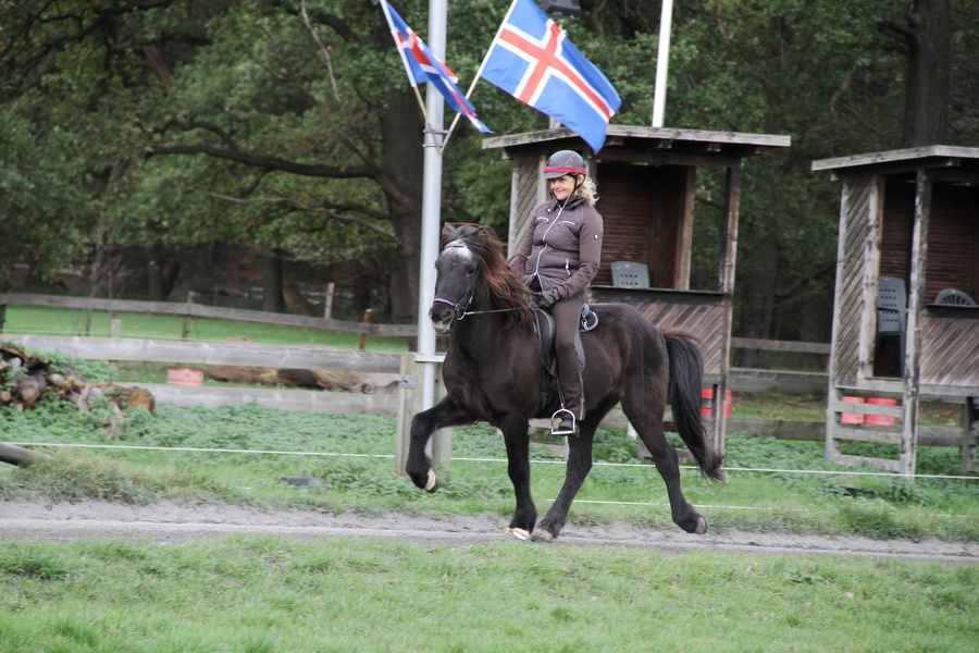 Viele motivierte Reiter reisten an, um zum Saisonende noch einmal auf Ovalbahn, Passbahn und dem Trailplatz in lockerer Atmosphäre zu starten. Der entspannte Rahmen war auch für Turnierneulinge perfekt, - der Ausflug von der Ovalbahn auf's Grüne wurde nicht mit Disqualifikation bestraft und Zuschauer wie auch der Sprecher durften ein bisschen helfen, wenn der Außengalopp nicht sofort bemerkt wurde. Die Bandbreite (vom Einsteiger bis zum erfahrenen Reiter und vom jungen Pferd, erstmals auf einer fremden Bahn, bis zum 19jährigen Tölt und Galoppstar Lótto) wie auch die individuelle Gestaltung der verschiedenen Prüfungen ließen keine Langeweile aufkommen. Erstaunlich viele Zuschauer folgten dem abwechslungsreichen Programm, bei dem man von Führzügelklasse bis zu sehr guten Vorstellungen in Tölt, Viergang und Rennpass alles zu sehen bekam. Es wurde viel applaudiert, mitgefiebert und es blieb auch Zeit für nette Gespräche im Haustkeppni - Café.